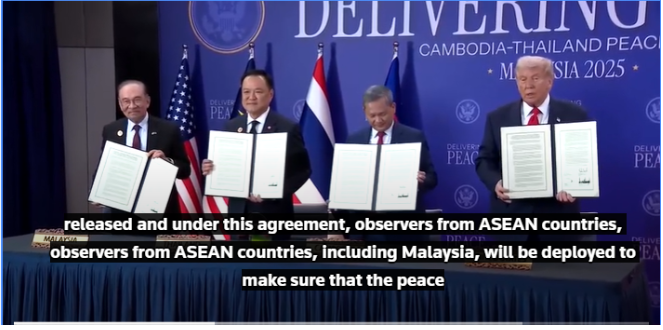 Ông Trump chủ trì lễ ký kết thỏa thuận ngừng bắn mở rộng giữa Campuchia và Thái Lan. Hai nước từng có một cuộc chiến biên giới không nhiều ý nghĩa hồi tháng 7. Cả hai nhà lãnh đạo đều cảm ơn tổng thống Mỹ vì vai trò của ông trong việc làm trung gian đàm phán hòa bình. Ngay sau đó, Mỹ ký thêm các hiệp định thương mại với Campuchia và Malaysia, mà ông Trump mô tả là “một thỏa thuận tuyệt vời cho cả hai bên.”